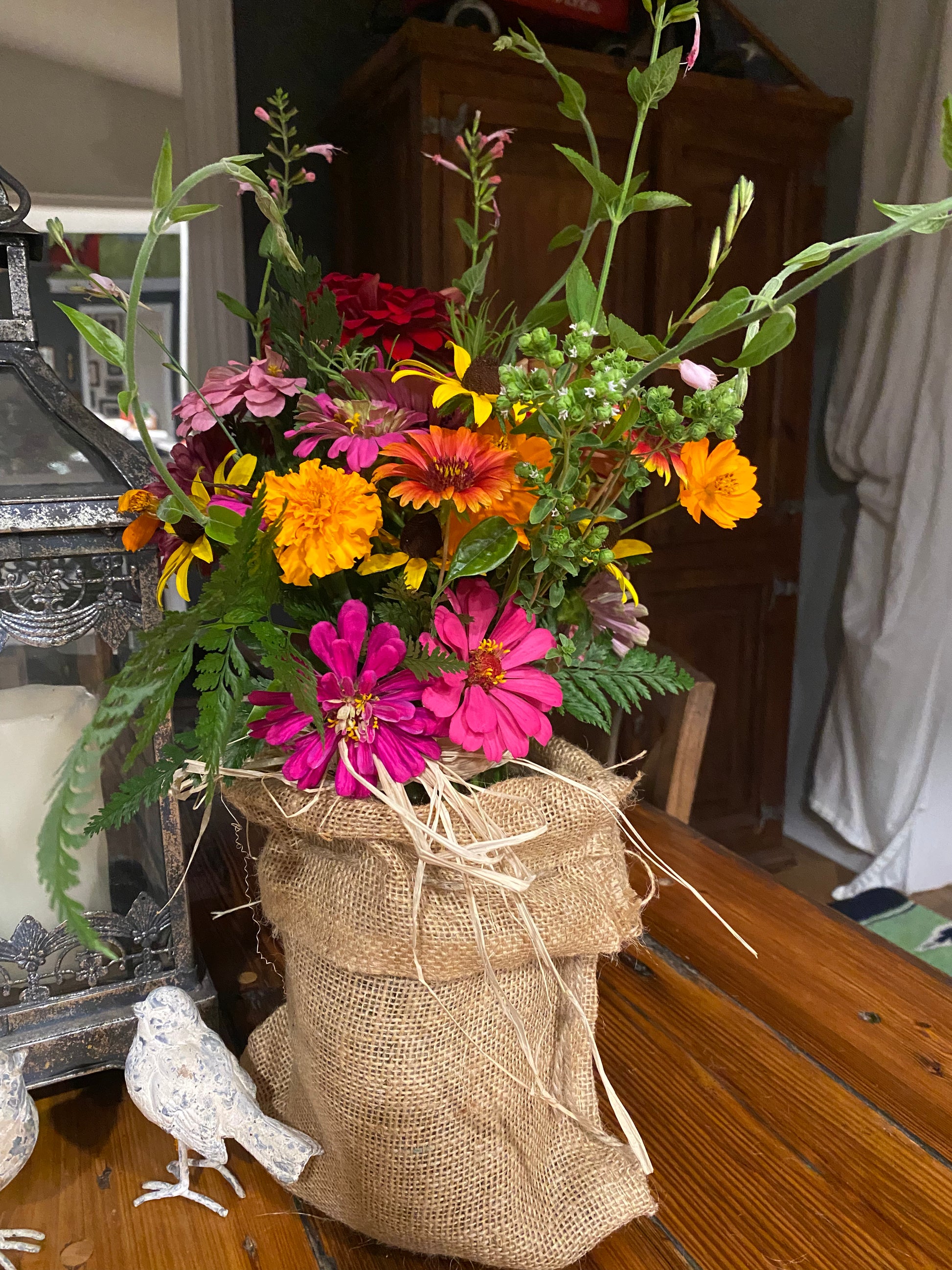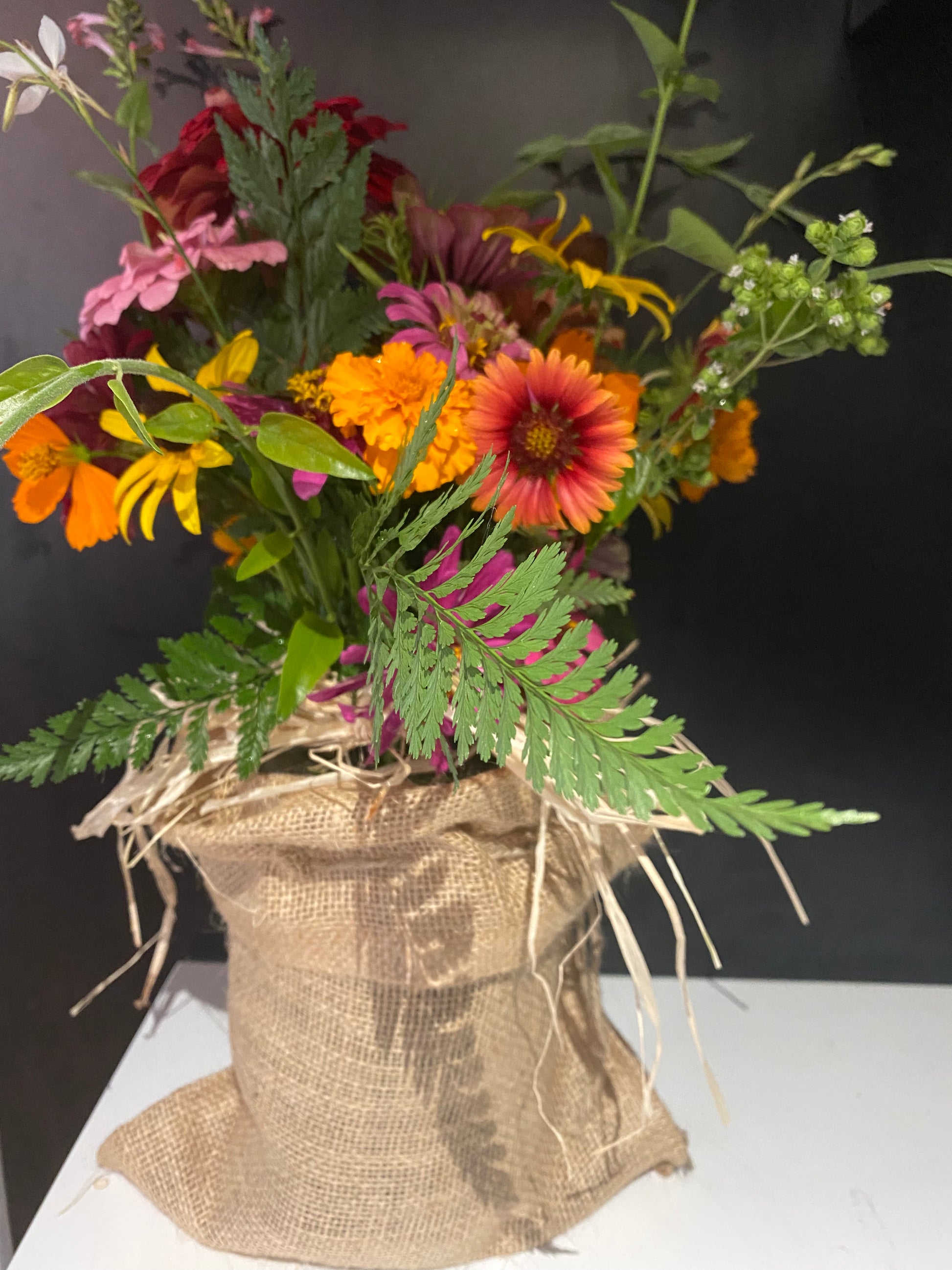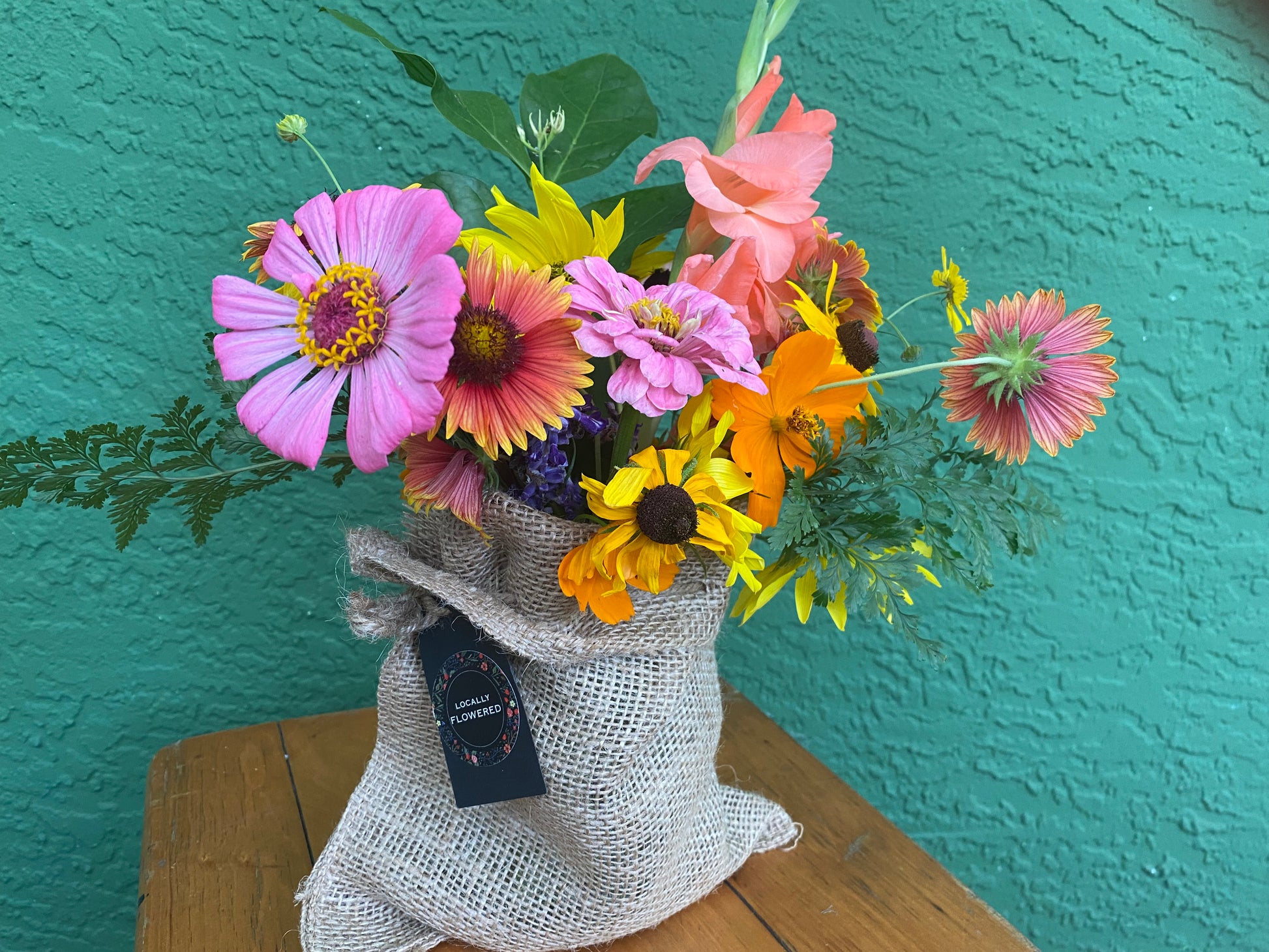 Show your support of nature with a flower bouquet of natives wildflowers, herbs and seasonal annuals. Your bouquet will include at least 15 flowering stems and assorted greenery and herbs arranged in quart-size jar in burlap bag. Available while seasonal wildflowers are blooming. (April-June) and (September - November) To order select local delivery at check-out.