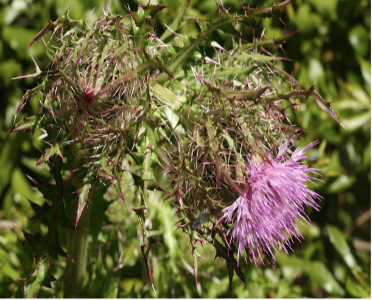 - Biennial with showy purple flower. Does have thorns and care needed in selecting planting site.